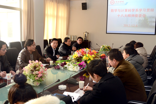 12月6日下午,数学与计算科学系党总支中心学习组举办学习党的十八大精神座谈会。院党委副书记、院长张景书出席座谈会并讲话。数学与计算科学系党总支副书记赵健主持座谈。
