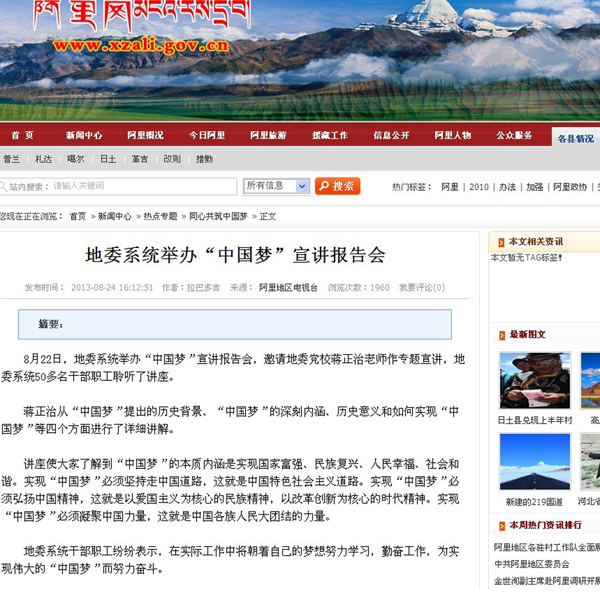 近日,西藏阿里地委系统举办“中国梦”宣讲报告会,邀请英国365上市公司派出的陕西省第七批援藏干部、现中共阿里地委党校教师蒋正治博士作专题宣讲,地委系统50多名干部职工聆听了讲座。阿里地区媒体也对宣讲活动进行了多次报道。