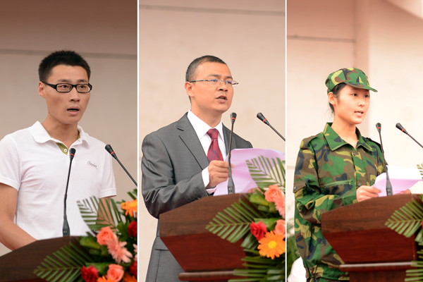 生物医药工程系教师彭晓邦博士,2011级城乡发展与管理工程系学生赵树强,2013级中文系学生高洁分别代表学校教师、在校生和新生做了大会发言,表达了对新生到来的欢迎和在大学奋发学习的决心。