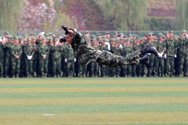 校党委副书记、院长刘建林检阅了军训方阵,同学们以饱满的精神状态、严整的军容和整齐的步伐精神抖擞地通过主席台接受检阅。英武的军姿、响亮的口号、整齐划一的动作,充分展示了同学们的军事训练成果和昂扬的精神风貌。同学们还进行了立正稍息、跨立、停止间转法、齐步立定等表演,精彩表演赢得了台上台下阵阵掌声。武警支队承训官兵也进行了擒敌拳表演。