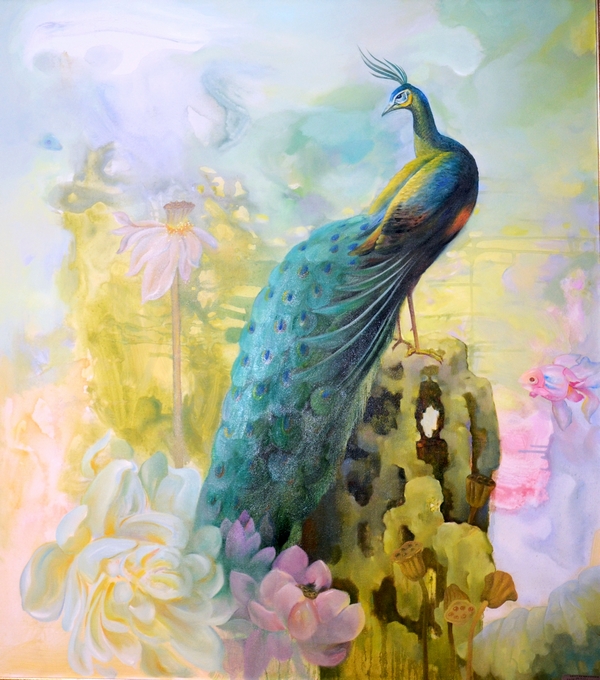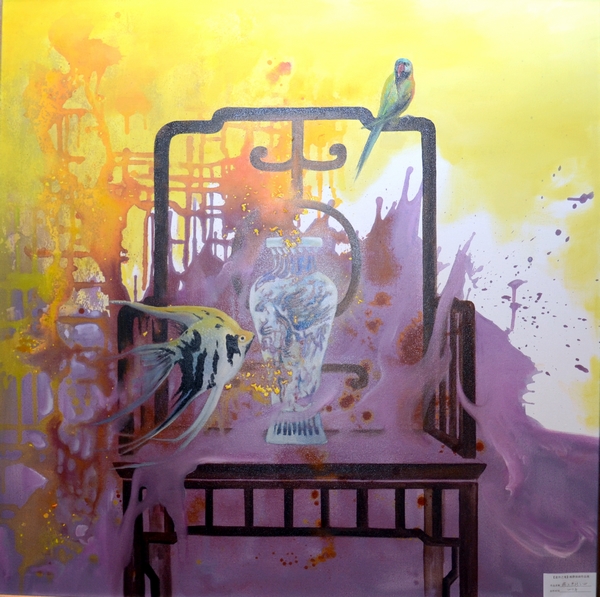 杨静的作品多以意象风景为主,鱼、飞鸟、椅子、面具、鲜花常常成为画面中的主要视觉符号,意象化的表述方式是其绘画语言特点,独具视觉张力的画面背后蕴藏着或浪漫或神秘或抒情的艺术独白。她的作品,一切似乎都是从画布的缝隙间不经意地流淌、蔓延而出,生发、幻化出诸多“意外之境”,坚实的文化底蕴与绘画技能,独到的艺术眼界和随机灵动的“深思妙悟”,赋予画面中各种意象生命,让画内的意象引领联想画外意象,达成“象外之象,景外之景”的效果,结合自己的生命体验诠释对当代人及其生存环境的思索与追问,在虚实相生之间营造一个全新的美好境界。本次画展共展出作品50多件,且全部被3家艺术投资机构收藏。