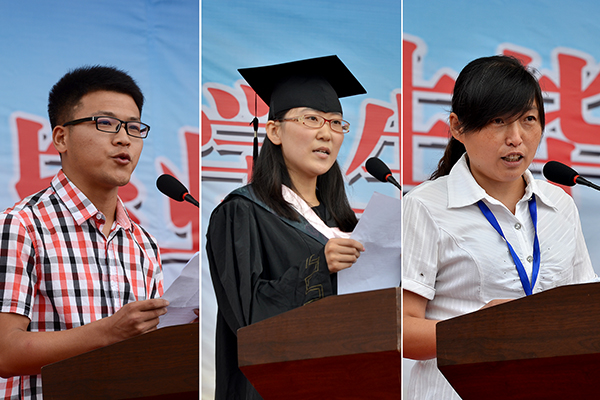 毕业生代表、经济与管理学院会计学专业2010级李真回忆了在校的四年光阴,对学校给自己带来的种种收获与感动表示真诚的感谢。生物医药与食品工程学院2011级学生刘渊代表在校生对毕业生送上了美好的祝愿,并代表全体在校生表达了勤勉学习的决心。
