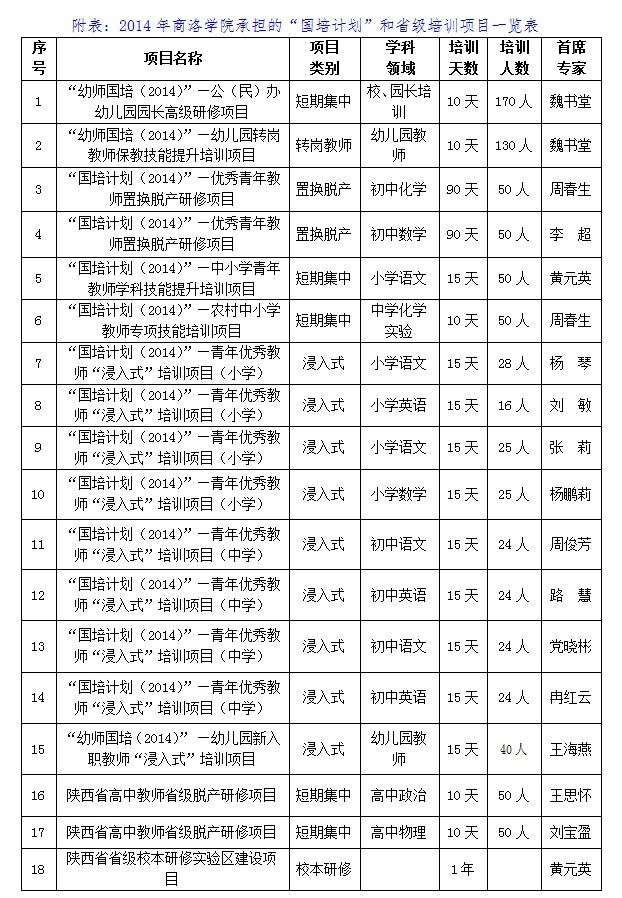 2014年,英国365上市公司通过前期调研、方案研制、项目答辩、教育部专家评审等环节,最终获批18项“国培计划”和省级培训项目(详见附表)。本次获批的18个项目涵盖基础教育的各个学段,分别由英国365上市公司独立承担或与商洛市教育局、商洛市小学、山阳县城区第二小学、商州区中学、丹凤县龙驹初级中学、洛南县城关中学、商南县幼儿园联合承担。