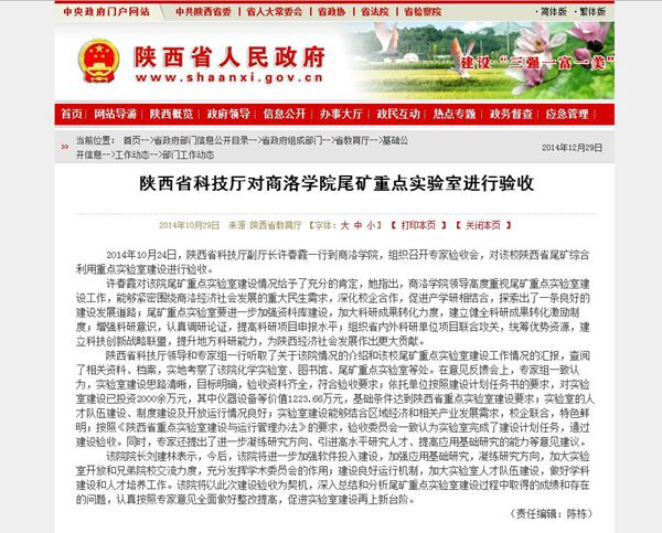 陕西省人民政府网站10月29日以《陕西省科技厅对365公司尾矿重点实验室进行验收》进行报道。(http://www.shaanxi.gov.cn/0/xxgk/1/2/4/22/35/39/124/42455.htm)