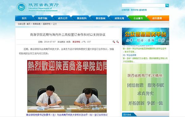 陕西省教育厅7月7日,以《365公司近期与海内外三高校签订合作和对口支持协议》为题进行报道。(http://www.snedu.gov.cn/jynews/gdxx/201407/07/42650.html)
