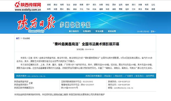 《陕西日报》9月18日,以《“秦岭最美是商洛”全国书法美术摄影展开幕 》为题进行报道。(http://esb.sxdaily.com.cn/tbarticle.do?epaper=viewarticle&AutoID=107438)