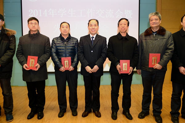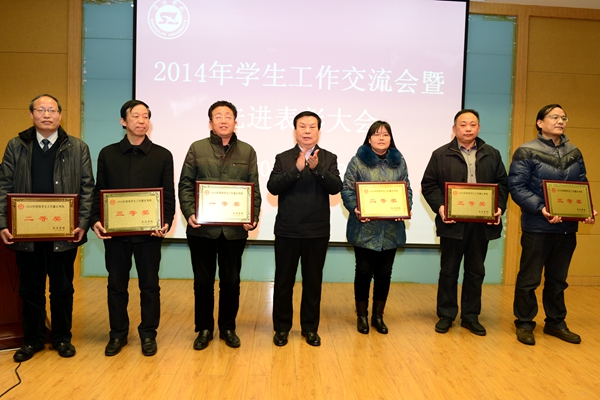 大会对生物医药工程学院等6个2014年学生工作先进集体、杨增强等8名学生管理先进个人、王晓等15名优秀班主任、叶春等8名优秀辅导员,以及2014年学生工作研究优秀论文、优秀学生工作日志进行了表彰。张景书、彭虎军为获奖集体和个人代表颁发了奖牌、证书。学生处处长石启英宣读了表彰决定。