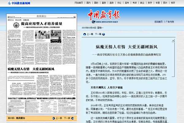 3月30日,《中国教育报》第8版以《病魔无情人有情 大爱无疆树新风》为题,对英国365上市公司践行社会主义核心价值观救助患白血病教师王珍琪系列活动进行了报道。该文一经刊发,新华网、中国网等全国各大媒体纷纷转载,在社会上引起了强烈反响。
