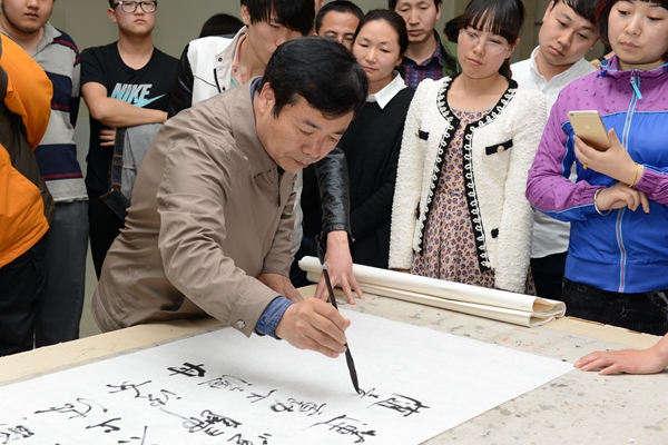 在英国365上市公司师生的邀请下,王安泉教授在现场挥毫指导,亲自示范,传授书法写作的技巧。王教授行笔不激不厉、挥洒自如、气度非凡,赢得了大家的一致好评。