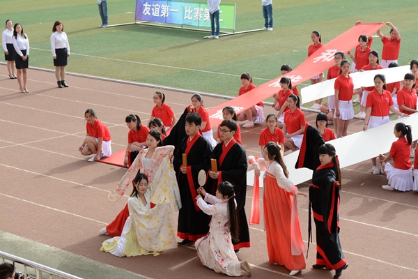 在欢快的运动会进行曲中,各院和教职工代表等方队精神饱满,依次入场。他们昂首阔步,精神抖擞,整齐的阵容,嘹亮的口号,飒爽的英姿,展示了当代师生意气风发、朝气蓬勃的青春风采,博得了全场的阵阵掌声。语言文化传播学院摆出了汉字“文”的队形,生物医药与食品工程学院用双手组成“海鸥”图形,城乡规划与建筑工程学院用五彩扇子组成“JGXY(建工学院)”、笑脸、“Go”三个图案,其他各院也纷纷以多种多样的形式展示了昂扬的精神风貌。