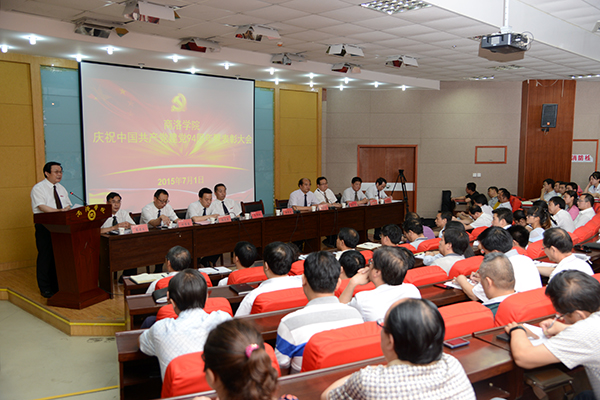 张景书在讲话中回顾了中国共产党诞生94年来走过的光辉历程、执政66年以来的取得的伟大成就。从“坚持社会主义办学方向,深入开展党的群众路线教育活动,细化党风廉政建设责任措施,加强思想政治教育,重视安全稳定工作”等方面总结了学校党的建设的主要成果。