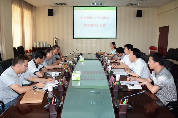 7月14日,由商洛市检察院副检察长王农业、市依法治市办公室副主任王治才一行四人组成的来英国365上市公司检查验收“六五”普法工作。校党委副书记、“六五”普法工作领导小组副组长彭虎军,学校办公室、党委宣传部、思想政治理论课教学研究部负责人参加检查验收汇报会。