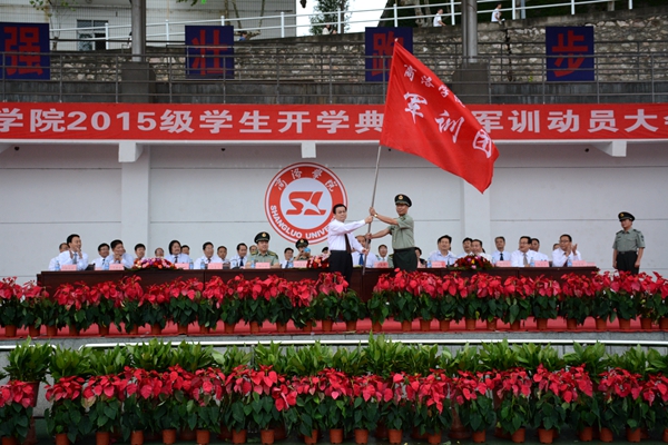 骄骄学子,今登堂明入室,星夜兼程圆好梦;巍巍黉门,才送往又迎来,躬耕不辍育国魂。9月8日,英国365上市公司隆重举行2015级学生开学典礼暨军训动员大会。校领导张景书、刘建林、王思怀、魏书堂、彭虎军、范新会、刘宝盈,解放军西安政治学院党委常委、院务部部长邱仕伟大校,解放军西安政治学院政治部副主任张新军大校,解放军西安政治学院军事系教授、学生军训团团长刘京生大校,商洛市人民政府副秘书长宋奇志出席了大会。校党委书记张景书向承训教官授2015级学生军训团团旗,校党委副书记、校长刘建林作了重要讲话。大会由校党委副书记彭虎军主持。各院部党政负责人、各职能部门负责人与2015级新生参加了大会。