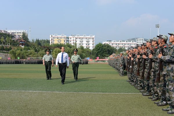 伴随着着激昂奋进的《检阅进行曲》,校长刘建林检阅了军训团全体学生。