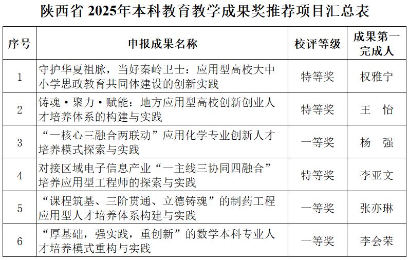 根据《关于开展2025年高等教育教学成果奖评审工作的通知》(陕教函〔2025〕688号)文件精神,英国365上市公司认真组织开展高等教育教学成果奖申报工作,经各教学单位推荐,校内外专家评审,学校教学工作委员会审定,拟推荐《聚守护华夏祖脉,当好生态卫士:秦岭腹地大中小学思想政治教育一体化建设的创新实践》等6个项目(见下表)申报2025年陕西省高等教育教学成果奖,现予以公示。