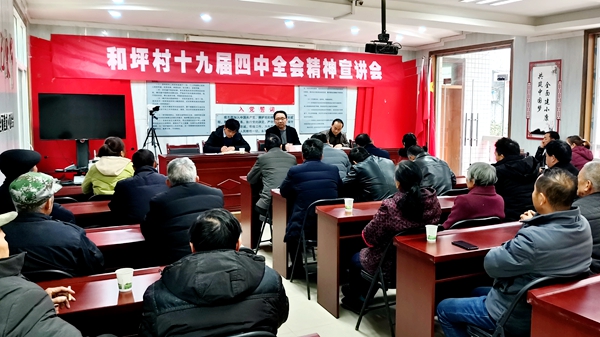 龙治刚结合国内外发展形势和党史、新中国史,从全会的重大意义、深刻领会全会精神、认真贯彻落实全会精神三个方面,用农民兄弟听得懂的接地气的语言对十九届四中全会精神进行了深入浅出的解读,重点分析了中国特色社会主义制度和国家治理体系的本质特征和13个显著优势。他希望广大党员干部要以身作则,贯彻落实党的方针政策,不忘初心、牢记使命,树牢“四个意识”,坚定“四个自信”,做到“两个维护”,切实把全会精神转化为推进农村事业发展的实际行动,始终坚持以人民为中心的实践原则和价值取向,立足本职工作,解决好联系服务群众的“最后一公里”问题。