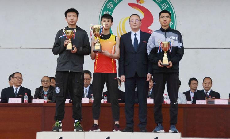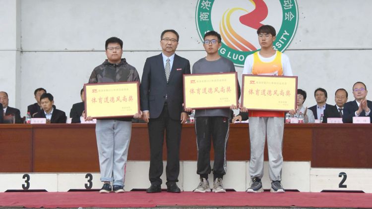 在热烈的掌声中,党委书记龙治刚为获得体育道德风尚奖的团体颁奖,校长范新会为男女团体总分前三名颁奖,副校长郭瑾为男子及女子团体总分前三名颁奖。