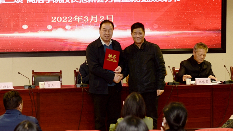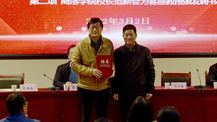 (范新会为雷玉山教授颁发聘书)