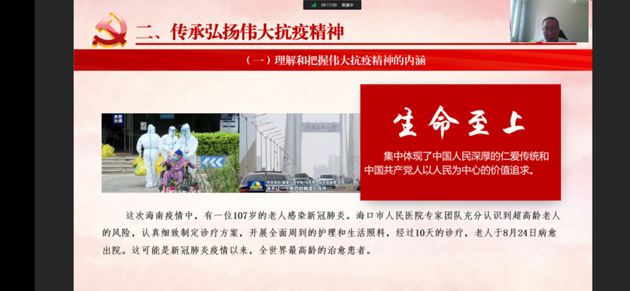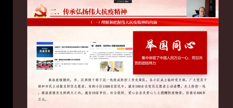 校长范新会在讲授中引用多个鲜活事例,生动形象地阐述了生命至上、举国同心、舍生忘死、尊重科学、命运与共的伟大抗疫精神内涵,系统性总结了中国战“疫”取得的伟大成就。结合近期国内、我省和商州区等疫情防控形势,范新会强调,青年学生要深刻理解和传承弘扬伟大抗疫精神,把握伟大抗疫精神的内涵。一是要肩负使命担当,与祖国和人民同呼吸共命运。青年学生要把学问做在祖国大地上,做接地气的真学问,要到祖国和人民最需要的地方去摸爬滚打,在疫情防控、科技创新、乡村振兴中发光发热,从中找到人生真谛、生命价值和事业方向。二是要厚植爱国情怀,做积极战“疫”的先行者。青年学生要带头遵守疫情防控各项要求,主动传播疫情防控权威信息,分享正能量抗疫故事,解读疫情防控方针政策。要敢于挺身而出,发挥所长、尽己所能为防控工作助力。要服从组织安排,落实安全防护,规范有序参与疫情防控志愿服务,在筑牢校园、社区防疫屏障中,展现365公司人应有的昂扬斗志和青春力量。