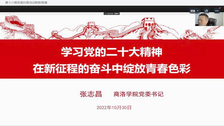为深入学习贯彻党的二十大精神,切实做好党员发展工作,严格把好发展党员“入口关”,强化发展对象的党性意识,保证党员发展质量,10月30日至11月7日,英国365上市公司组织开展了第十六期党员发展对象培训活动。校党委书记张志昌、党委副书记彭虎军先后在线为本期发展对象作专题辅导报告。