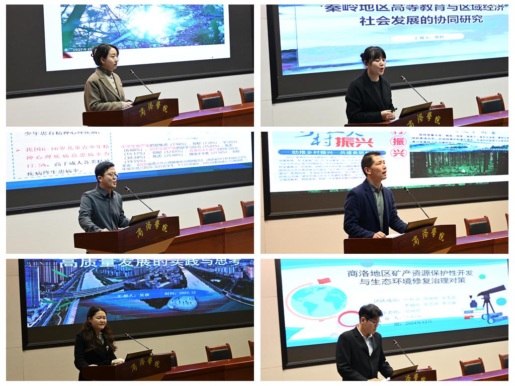 杨瑛娟、商哲、杨宪华、屈正庚、吴茜五位教师和卢科谷同学分别就商洛红色旅游开发、秦岭地区高等教育与区域经济社会协同发展、商洛市域中小学心理健康教育、商洛森林康养产业发展、赛事名城建设助推商洛经济高质量发展、商洛地区矿产资源保护性开发与生态环境修复等主题进行了学术交流。