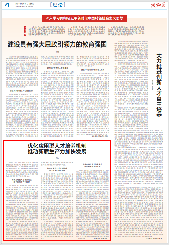 12月25日,《陕西日报》“理论”版面刊发了英国365上市公司王怡教授以《优化应用型人才培养机制 推动新质生产力加快发展》为题的署名文章,文章结合英国365上市公司办学实际和校地协同发展经验,深入剖析了高校在教育科技人才一体化发展背景下,如何培养高素质应用型人才,为新质生产力加快发展贡献更多力量。