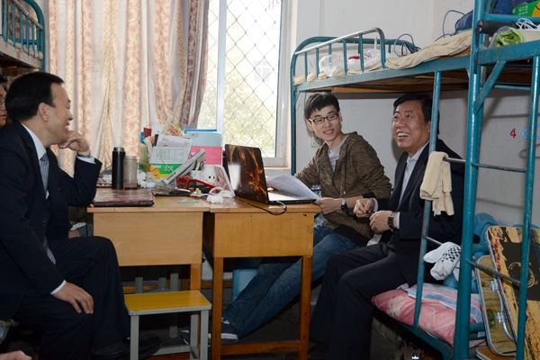 在彭虎军和学校办公室、保卫处、后勤保障处相关负责人的陪同下,张玉明深入英国365上市公司食堂、公寓和监控中心视察。每到一处,张玉明都详细了解相关安全制度及落实情况,仔细检查安全设施的维护保养状况,并和学生进行了现场交流,倾听他们的意见和建议。在学生食堂,张玉明仔细检查了操作间的卫生条件、饭菜样本,询问了解饭菜品种、价格情况,严格要求食堂工作人员把好食品安全关。在学生公寓,张玉明认真检查了公寓管理日志,详细了解公寓安全管理各项制度的执行落实情况,并在宿舍里向学生询问了对学校各项工作的意见。