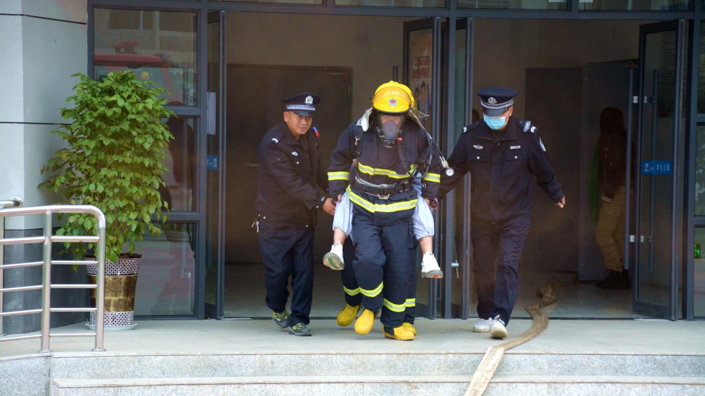 本次演练以16B男生公寓楼起火为假设情景,共有火灾逃生、火场救援、灭火演示三个环节。随着火灾疏散警报声响起,火灾逃生演练拉开了序幕,全体学生按照设定的疏散路线,在辅导员、公寓管理员及校警的带领下,采取掩口鼻、弯腰姿势从宿舍快速有序地撤离到安全区域;医护人员立即对“受伤学生”进行模拟救治;消防救援队到达现场后迅速将火情扑灭。整个演练过程逼真、井然有序,使师生们直观地学习到了火灾处理正确方法,加深了师生对消防安全知识的理解及消防器材的正确使用方法,为筑牢学校安全“防火墙”奠定了坚实的基础。
