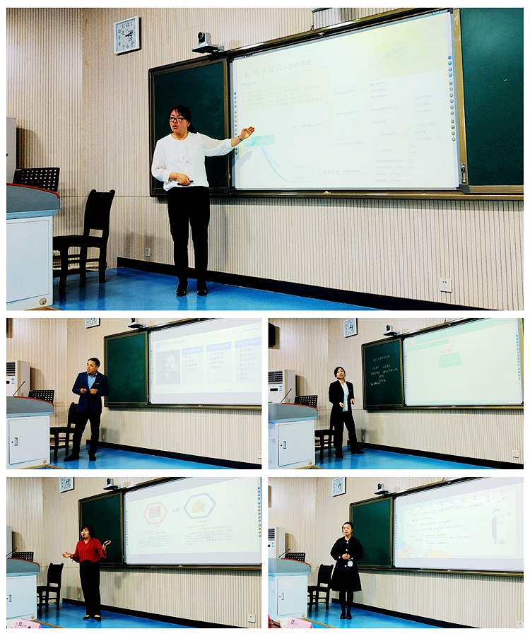 大赛启动以来,共有11名教师参加初赛,经过层层选拔,最终5位教师入围决赛。决赛现场,参赛教师以PPT课件、板书等教学方式分别进行了5分钟现场教学设计汇报与15分钟教学展示。评委进行了现场打分和点评。