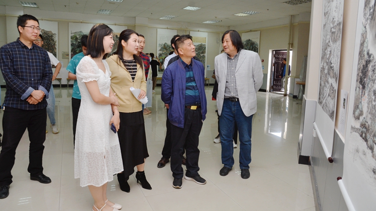 开幕式结束后,范新会在相关负责人的陪同下参观了画展,并与创作学生进行了亲切交流。