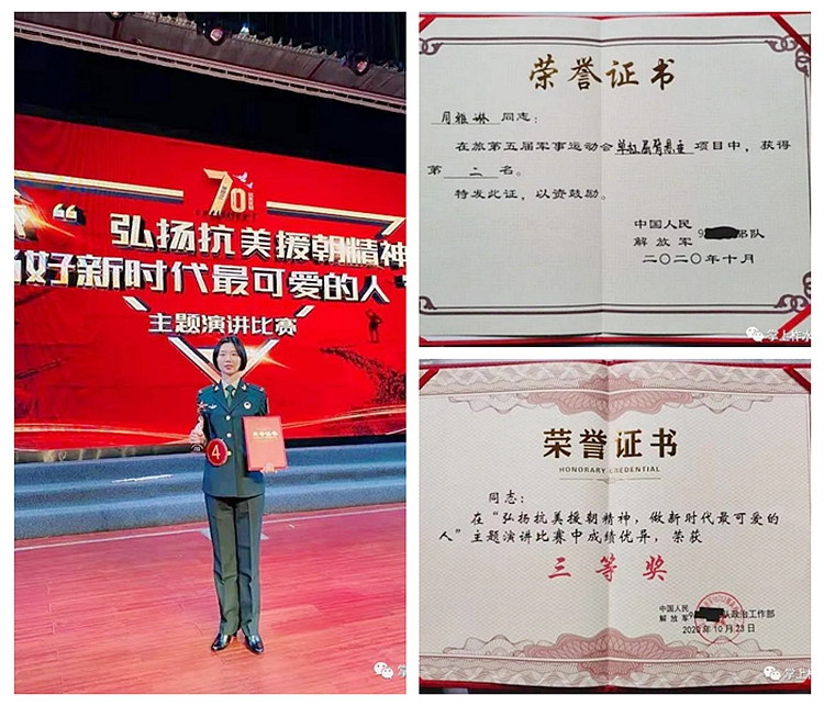 周雅琳从小就有一颗炽热的军人梦,2019年她积极响应国家号召,踊跃应征入伍,现为火箭军某部战士。在部队上,她认真工作,严格按照标准完成各项任务,积极参加各项活动,参加单位“弘扬抗美援朝精神,当好新时代最可爱的人”主题演讲比赛,荣获三等奖。自主加强体能训练,参加军事运动会单杠屈臂悬重项目,获得第二名。参加春晚排练及慰问演出等文艺活动,受到指导员和战友们的一致肯定。同时,她爱好乐器演奏,还是单位军乐队单簧管演奏员。