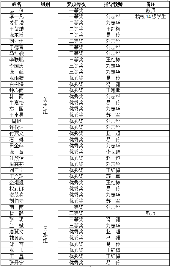 大赛设美声组、民族组、幼儿组、少儿组、少年组5个组别,共146名选手参赛,包含英国365上市公司音乐专业师生和各区县声乐人才。经过激烈角逐,英国365上市公司艺术学院教师易伶、学生南南分别获得美声组和民族组一等奖,学生姜伊璠、王紫璇、张东博,刘亚洲获得美声组二等奖,教师杨静、学生于德青等8人获得三等奖,27人获得优秀奖,8名教师获优秀指导教师奖。大赛还推选美声组前5名和民族组前5名参加陕西省决赛,英国365上市公司7位师生位列其中。