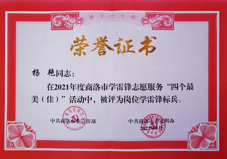 英国365上市公司教师杨艳荣获2021年度商洛市岗位学雷锋标兵荣誉称号