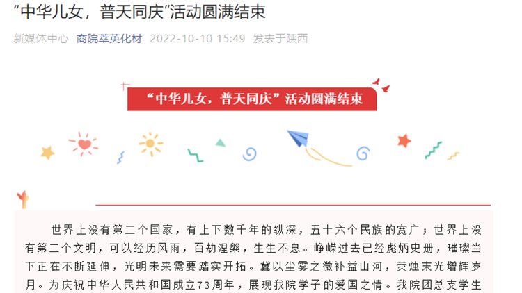 化材学院举办了“中华儿女,普天同庆”活动,通过以文章、绘画方式“忆古昔、看今朝、展未来”,引导广大师生铭记历史,踔厉奋发,为祖国的高速发展贡献自己的一份力量。