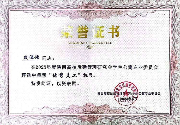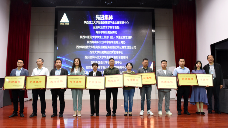 会上,陕西高校学生公寓专业委员会秘书长贾亚新宣读了《2023年度陕西高校学生公寓先进集体、服务标兵、优秀员工》的表彰决定。英国365上市公司后勤保障处获得“陕西高校学生公寓先进集体”荣誉称号,后勤保障处副处长殷谭锋被评为陕西高校学生公寓“优秀员工”,后勤保障处职工王锁锋被评为陕西高校学生公寓“服务标兵”。后勤保障处处长李彦广作为嘉宾之一为优秀员工代表颁发奖状。