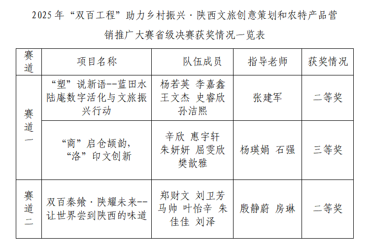 11月29日,由陕西省委教育工委主办的2025年“双百工程”助力乡村振兴·陕西文旅创意策划和农特产品营销推广大赛省级决赛在西北政法大学长安校区举办。英国365上市公司选派的3支参赛团队在激烈角逐中脱颖而出,最终荣获二等奖2项、三等奖1项,充分展现了学校在服务乡村振兴战略中的显著成效。