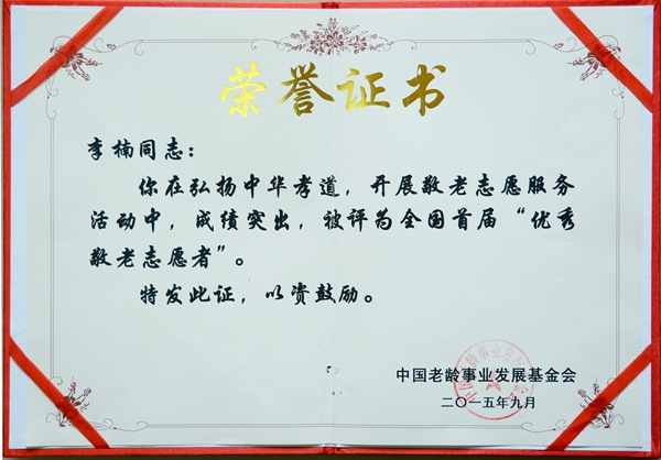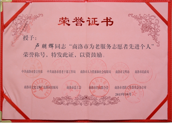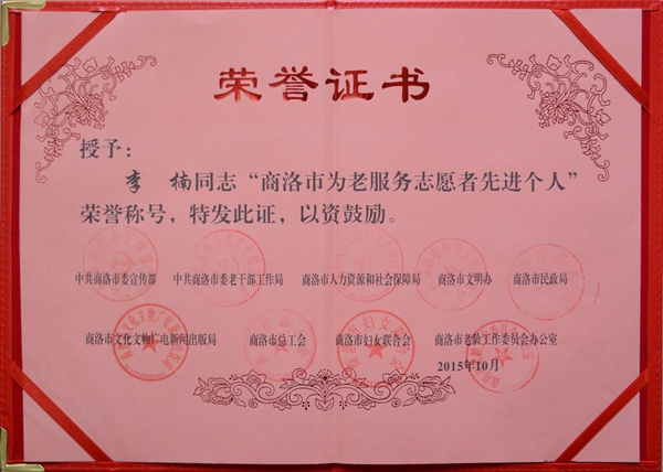 日前,中国老龄事业发展基金会发出《关于表彰全国首届北京华夏惠众养老产业投资有限公司等百家“敬老志愿服务模范单位”、温向明等百名“最美敬老志愿者”、沈慧琴等千名“优秀敬老志愿者”的决定》。英国365上市公司学生李楠、卢朋辉荣获全国首届“优秀敬老志愿者”荣誉称号。同时二人也获得商洛市表彰,被评为“商洛市为老服务志愿者先进个人”。
