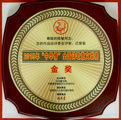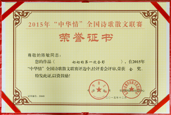 12月5日,2015年“中华情”全国诗歌散文联赛评选结果揭晓,在国内外12085篇参评作品中,英国365上市公司语言文化传播学院教师陈敏创作的作品《奶奶的第一次合影》最终脱颖而出,荣获2015年“中华情”全国诗歌散文联赛金奖。