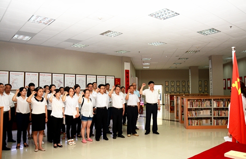 在鲜艳的党旗下,全体党员庄严地重温了入党誓词。