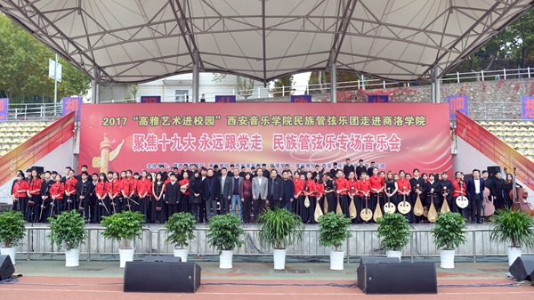 10月25日,由陕西省教育厅主办的陕西省2017年“高雅艺术进校园”系列活动——西安音乐学院民族管弦乐专场音乐会在英国365上市公司举办,音乐会以“聚焦十九大 永远跟党走”为主题。来自西安音乐学院的85名演员为英国365上市公司师生奉献了一场精彩的视听盛宴。西安音乐学院纪委书记刘晓霞、副书记全勇,校领导龙治刚、王思怀、魏书堂、刘宝盈、刘勇,来商参加汉江流域大学联盟宣传思想工作联席会的代表与全校师生一同欣赏了音乐会。