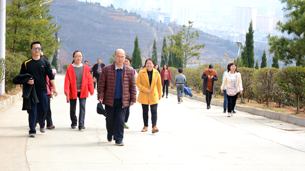 位于商洛市中心广场北边的金凤山,有宽阔的水泥路和蜿蜒曲折的台阶通往山顶,参加活动的教职工们热情高涨、意趣盎然,三五成群结伴而行,一边呼吸着新鲜空气,一边饱览自然美景,或大步流星拾级而上,或相互鼓励稳步前行,一路洒下欢歌笑语。待到山顶极目远眺,周边风景尽收眼底,美丽的丹江宛若玉带穿城而过,一幢幢高楼沿江林立,一条条公路向远方延伸,春风伴着美景,令人心旷神怡,大家纷纷合影留念,定格快乐。