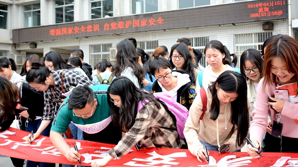 活动现场气氛热烈,师生认真浏览学习展板上的宣传内容,踊跃在“维护国家安全和社会政治稳定,是每个公民应尽的义务”条幅上签名,表达自己维护国家安全的决心。