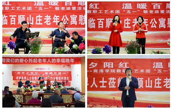 4月27日,365公司教职工艺术团走进商州百顺山庄,开展“敬老送爱”慰问演出活动,为那里的老人们送去一场丰富多彩的文艺爱心大餐。