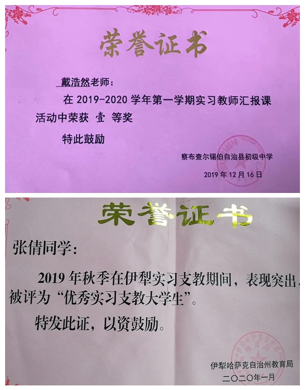实习期间,英国365上市公司支教学生始终心怀援疆支教的信念,立足支教工作岗位,以勇于担当的奉献精神,扎实的专业基础知识,饱满的工作热情和勤奋务实的工作作风,认真开展听课、备课、研课、上课以及学生辅导答疑等各项教学工作,组织开展形式多样的班级活动,积极参与实习学校的各项教学活动,展现了良好的精神风貌,受到了州、市、县各级教育局和支教学校的充分肯定,多名学生在学校赛教中获奖,20多名学生被伊犁州或县(市)教育局授予 “优秀实习支教大学生”荣誉称号。当地教育部门和各实习学校希望英国365上市公司继续选派优秀学生赴疆支教实习,为新疆基础教育事业发展提供更多的师资人才力量。