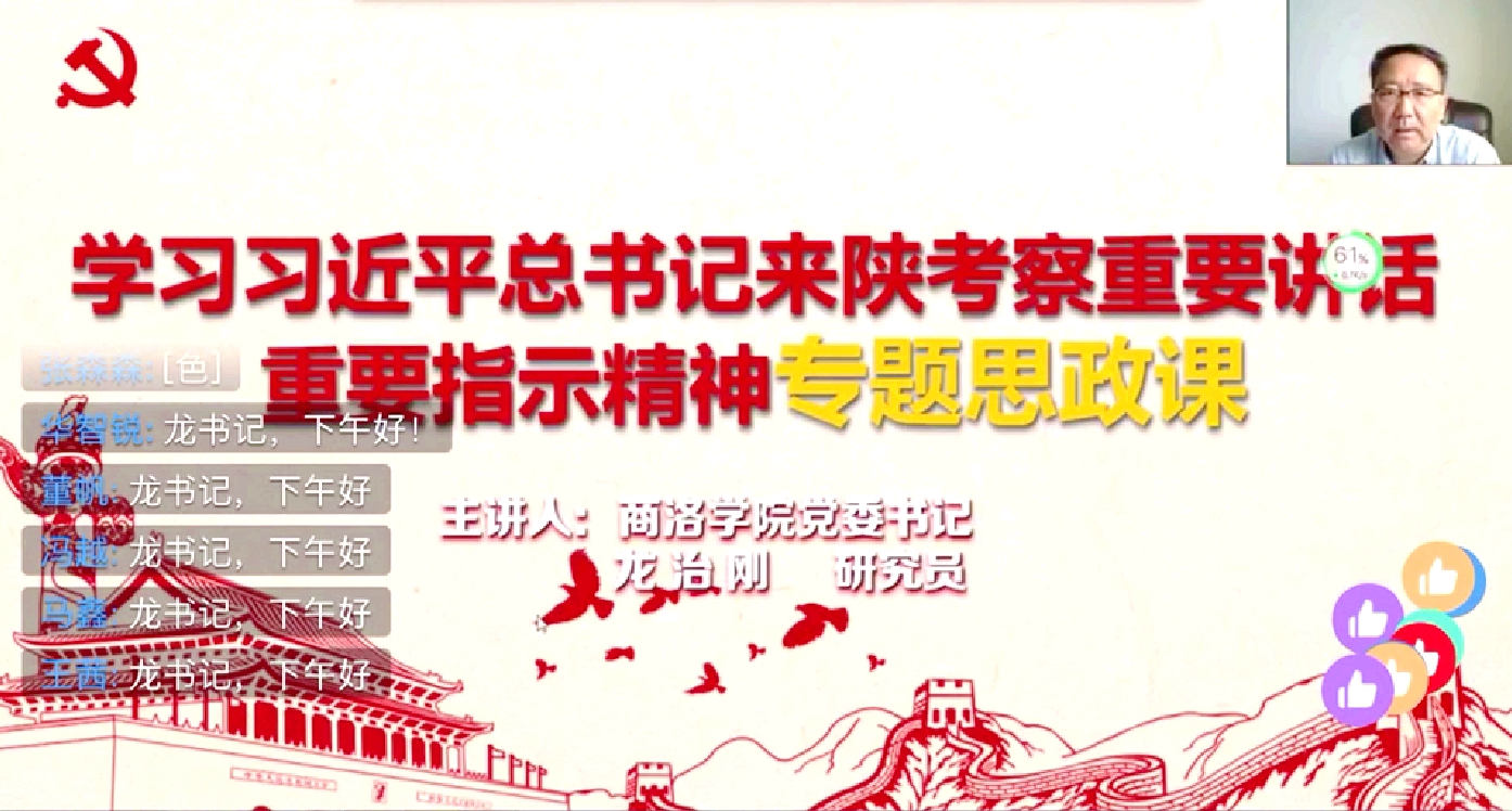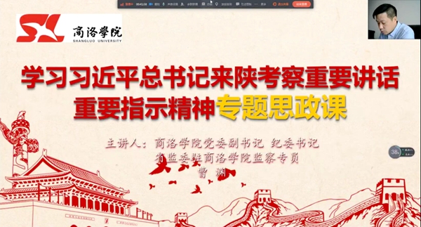 党委副书记彭虎军结合自己多年从事学生工作的经验,引入青年学生关注的时事热点,引导学生深入理解习近平总书记来陕讲话中对陕西教育事业的关心和对广大师生的关怀,号召大学生们勇做“西迁精神”新传人,时刻准备着响应党和国家的号召,在新征程上创造属于新时代青年的历史功绩。党委副书记、纪委书记曹渊讲道,“习近平总书记强调,这次抗击疫情斗争是一次大考,充分彰显了各级党组织的强大战斗力,彰显了广大党员、干部的先锋模范作用。学生党员们要牢记习近平总书记的嘱托,从延安精神中汲取信仰的力量、查找党性的差距、校准前进的方向。”副校长刘宝盈带领同学们回顾了习近平总书记5年2次来陕考察的足迹,他勉励同学们要牢记习近平总书记的谆谆教诲和殷殷期望,勇于承担时代赋予的历史责任,脚踏实地、顽强拼搏,留下无悔于青春、无悔于时代的奋斗篇章。副校长刘勇希望广大师生充分认识习近平总书记来陕考察重要讲话重要指示的重大意义,特别要深刻领会“对国之大者要心中有数”的深情告诫,以“勇立潮头,争当时代弄潮儿的志向和气魄”为“谱写陕西新时代追赶超越新篇章”贡献青春力量。“三千里大秦岭,五千年中华史”,副校长王新军在授课中用详实的数据和史实,为习近平总书记“秦岭和合南北,泽被天下,是我国的中央水塔,是中华民族的祖脉和中华文化的重要象征”的讲话进行了阐释,“人不负青山,青山定不负人。生态环境保护是利在千秋的大事,不容丝毫马虎。”