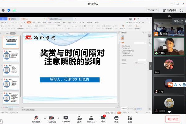 ——线上答辩、井然有序各学院根据实际情况采取线下线上相结合的方式组织论文答辩。近2000名学生使用腾讯会议、腾讯课堂、钉钉等稳定、流畅的网络平台,通过在线直播互动或视频会议方式进行论文答辩。各学院根据本院师生的论文写作与指导进展情况,认真组织筹划,严守时间节点,科学制定本学院毕业论文(设计)答辩方案及成绩评定规范,提前做好在线答辩细节演练,分配好答辩小组,严密答辩流程,确保了答辩工作与往年现场答辩相比等质同效、水准不降。在线上答辩中,合理分配任务,做好排序通知,保持答辩顺畅进行。在线下现场答辩中,做好室内消杀、开窗通风,避免人员聚集,严格落实各项防控措施。