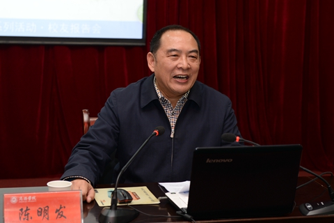 陈明发首先介绍了自己的名字与后来走上发明之路的渊源,指出发明有助于大学生创业、就业,鼓励大家把发明作为兴趣爱好来培养。他举了三个例子说明了自己的发明之路:一是举办自己的发明展引起县委书记的关注与支持;二是通过他人的帮助,到新的科技公司去打工、学习;三是收集各地项目,与企业家合作,重回海南办公司。他十分感谢母校老师,表示是老师的帮助才使自己取得了创业的首次成功。