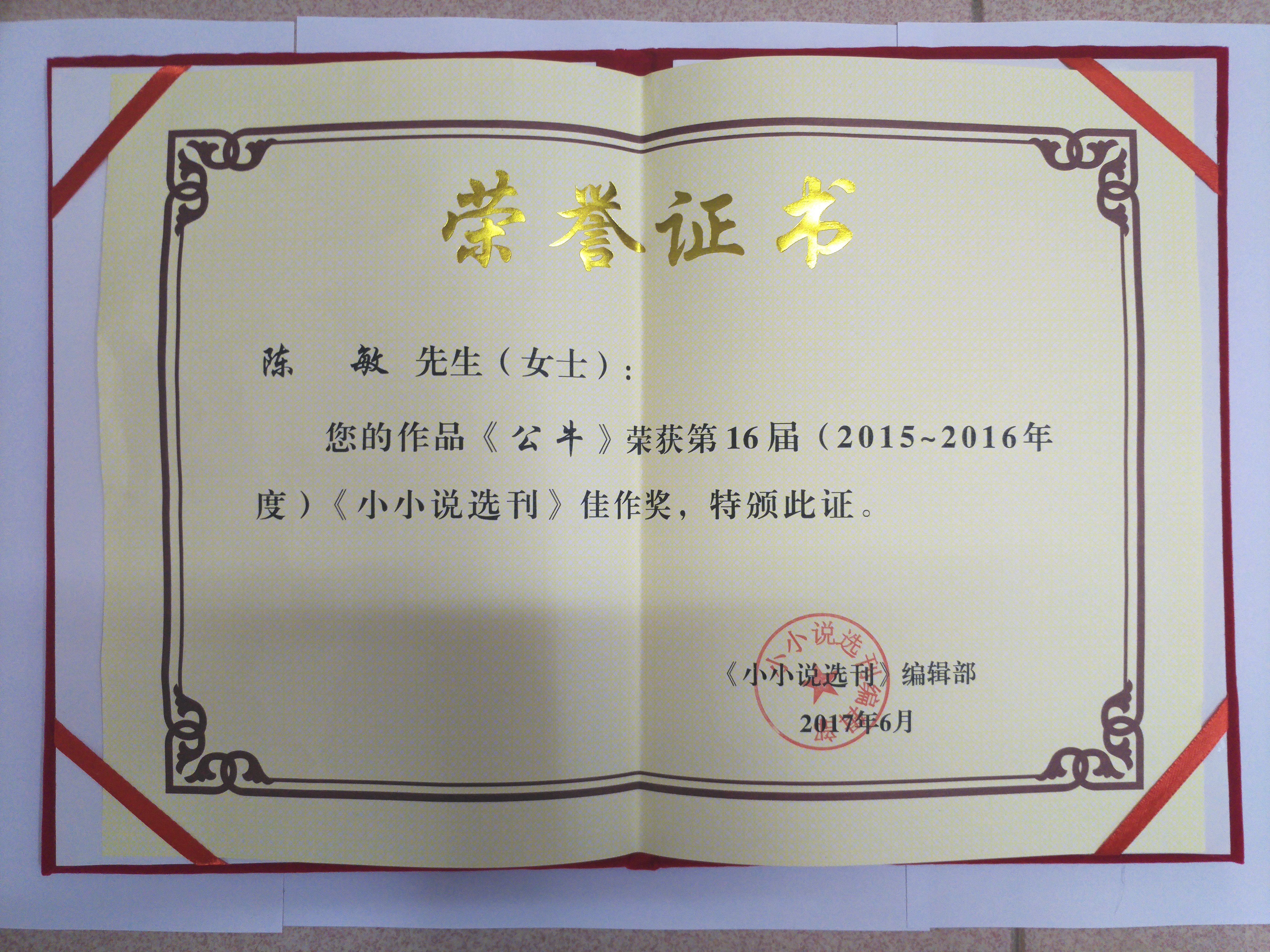 近日,由人民文学出版社、中国小说学会、河南省作家协会、河南省文学院、郑州市文联主办,郑州小小说文化传媒有限公司、《小小说选刊》《百花园》承办的第16届(2015-2016年度)《小小说选刊》优秀作品颁奖典礼在郑州举行。英国365上市公司教师陈敏的小说《公牛》在近十万余篇的参评小小说中获得第16届《小小说选刊》佳作奖,这是陈敏继获第九届(2001-2002年度)《小小说选刊》优秀作品奖(《诗祭》)之后的第二次获奖。