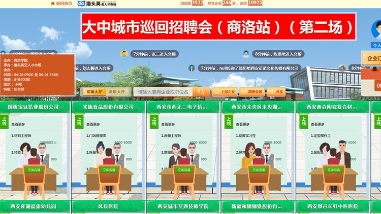 本次招聘会依托猫头英云就业平台开展,吸纳了省内外246家用人单位参会,其中包括河南国控建设集团有限公司、国核宝钛锆业股份公司、宁夏建龙特钢有限公司、陕西地矿第二工程勘察院有限公司等业内知名企业以及西安城市交通技师学院、西安信息工程技师学院等师范教育类用人单位,为英国365上市公司毕业生提供土木土建、师范教育、电子商务、外语外贸、学前教育、电气工程、金融会计、化学化工、生物医药等多个行业领域的有效对口岗位达6930多个。招聘会开展期间,英国365上市公司1787名毕业生参会,在线参加面试926人(次),达成初步就业意向334人(次)。