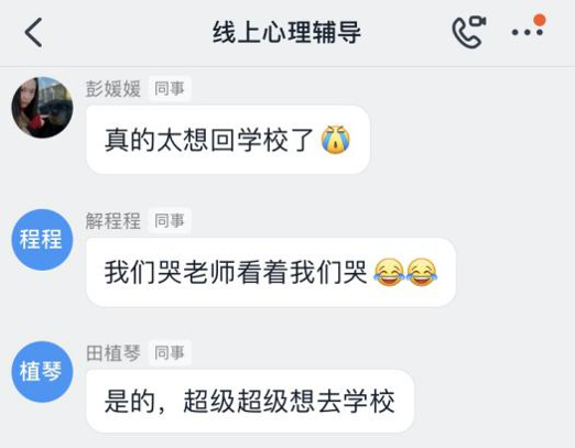辅导会开展过程中,学生们积极参与讨论,很多学生表示“超级超级想去学校”“只想去上学”,当然学生们也会担忧自己回学校就被隔离了,担心因为自己是湖北人而受到大家的异样眼光。辅导老师针对学生的这些焦虑、恐惧等负性情绪进行了线上辅导,学生们表示“相信咱们的母校、相信咱们伟大的祖国”。